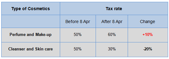 The following table illustrates the postal tax change of cosmetics.