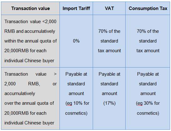 3. No import tariff when the single transaction value is below 2,000 RMB and annual transaction value does not exceed 20,000 RMB. The VAT and consumption tax will be charged 70% of the standard tax amount. Over the single value or the annual value, full tax will be charged as general trading.