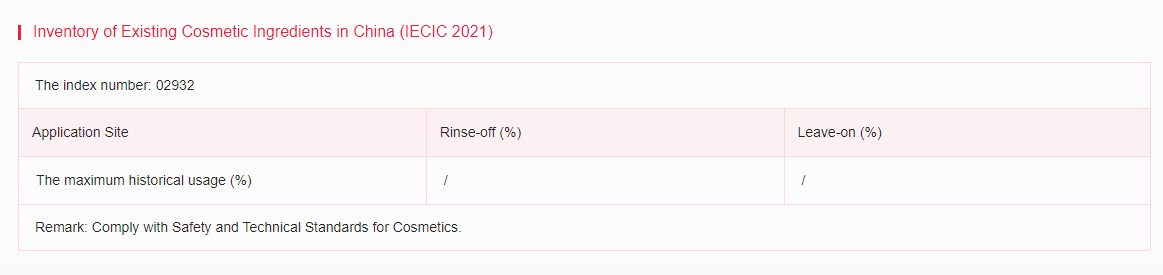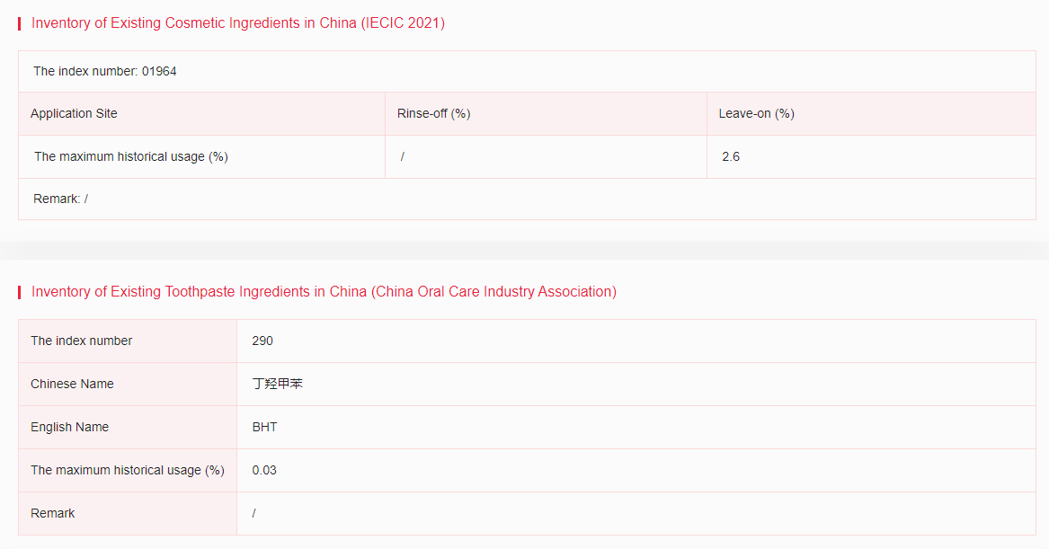 Butylated Hydroxytoluene has been included in the Inventory of Existing Cosmetic Ingredients in China (IECIC 2021) with the maximum historical usage in leave-on cosmetic products of 2.6% and the Inventory of Existing Toothpaste Ingredients in China (China Oral Care Industry Association), with the maximum historical usage of 0.03%.