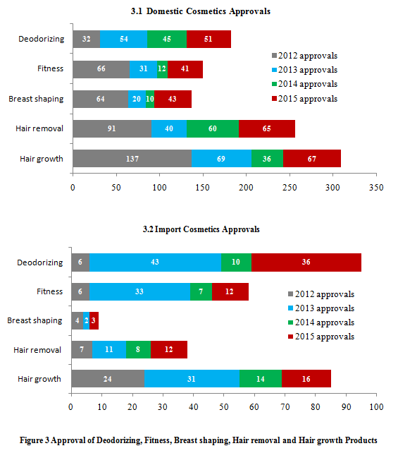 Among the categories of deodorizing, fitness, breast shaping, hair removal and hair growth, there are more approved domestic products than imported products every year. Since China’s cosmetic regulations are more complicated compared with other countries, it causes to moreobstacles for the registration of imported special use cosmetics.