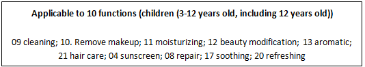 Cosmetics with the function of cleaning, moisturizing, refreshing and sunscreen, etc. are applicable for children under 12 years old (including 12 years old).