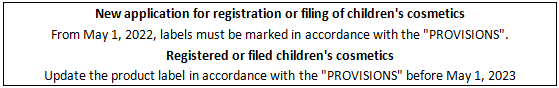 - Ban to use cosmetic ingredients prepared by new technologies such as gene technology and nanotechnology (Note: If necessary to use, please explain the reason and make safety evaluation of cosmetics used on children)