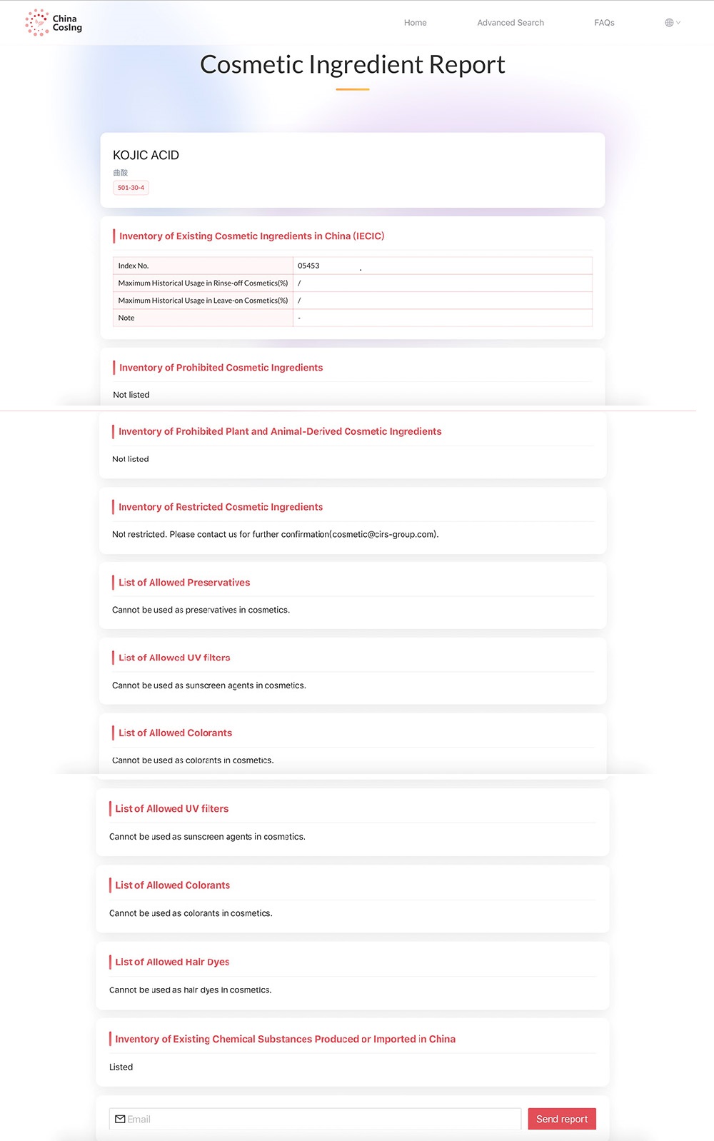 The query information of Chinacosing Database of Cosmetics Raw Materials independently developed by CIRS Group shows that kojic acid has been listed in the IECIC, and there is no restriction condition on Safety and Technical Standards for Cosmetics. If enterprises use this raw material in cosmetics, they need to carry out safety assessments to ensure its safety.
