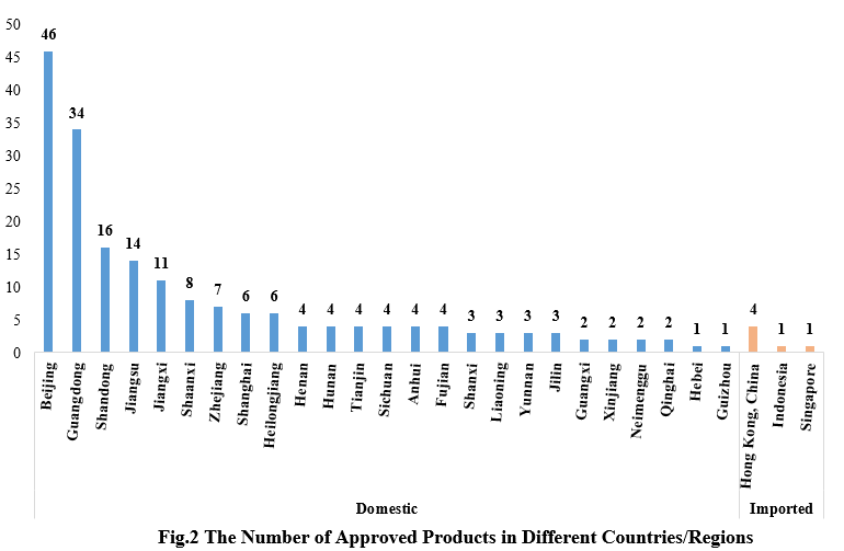 Among the 200 approved new products, domestic products are from 25 provinces (municipalities and/or autonomous regions). Beijing ranked first with 46 products, accounting for 23.71% of the total domestic new products. Imported products are from Hong Kong (four products), Indonesia (one product), and Singapore (one product).