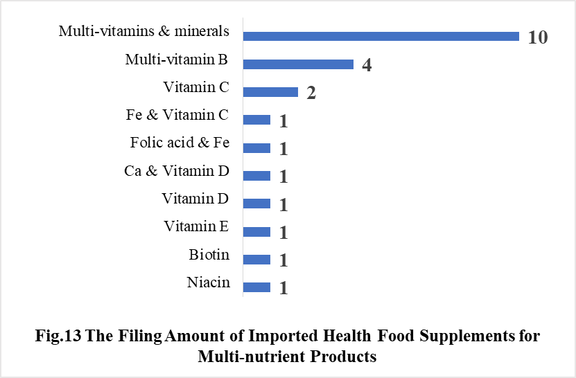 In 2021, the number of imported products supplementing Multi-vitamins & minerals is the most, which is 10, followed by the products supplementing Multi-vitamin B and Vitamin C, which is 4 and 2 respectively.