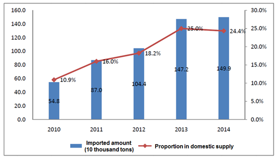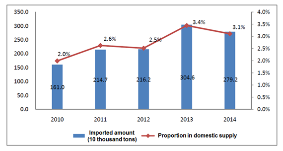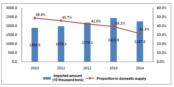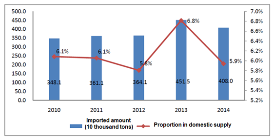 Figure 7 Imported amount and proportion in domestic supply of edible vegetable oil from 2010 to 2014