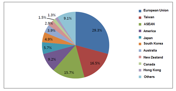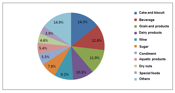 During the 5 years from 2010 to 2014, China imported food from 213 countries or regions, among them, the top 10 in imported trade volume were: ASEAN, the European Union, America, New Zealand, Brazil, Canada, Russia, Australia, Argentina and South Korea, with a total value of 172.77 billion dollars, which accounted for 84.3 % of the total value; The imported food categories almost covered all kinds of global excellent foods, grease and oil, aquatic products, dairy products, meat, wine, sugar, grain and products, beverage, dry nuts and canned food are the main imported categories, with a total value of 192.14 billion dollars, which accounted for 93.8% of the total value.More detailed information was showed in the following figures (1-4).