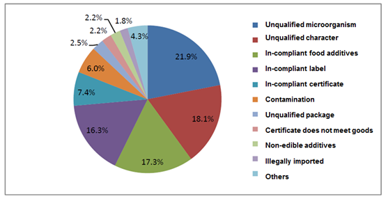Dairy product | ? Total 1,205 batches were unqualified in the 5 years. ? Unqualified character, unqualified microorganism, and in-compliant label were the 3 main in-compliant reasons, accounting for 79.22% of the total unqualified dairy products batches. ? For the infant formula milk powder, there were total 57 batches unqualified in the 5 years (just inspected unqualified batches in 2013 and 2014). Unqualified character, in-compliant label, and food additives exceeded or use overrun were the main unqualified reasons, accounting for 80.7% of the total unqualified infant milk powder batches. |