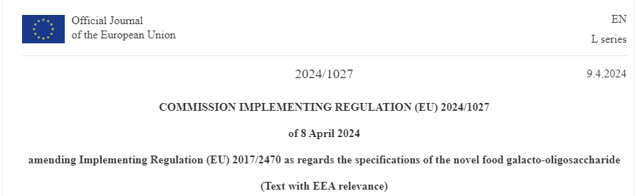 On April 9, 2024, the European Commission issued Implementing Regulation (EU) 2024/1027, amending the conditions of use of the novel food galacto-oligosaccharide. This Regulation shall enter into force on the twentieth day following that of its publication in the Official Journal of the European Union.
