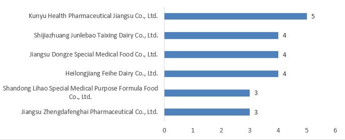 The 66 FSMPs approved for registration in 2024 involved 36 applicant units. As shown in Figure 6 below, Kunyu Health Pharmaceutical Jiangsu Co., Ltd. obtained five special medical purpose food approvals in 2024, ranking first. Additionally, three companies each obtained four special medical purpose food approvals, belonging to the second tier. Two companies each obtained three special medical purpose food approvals, belonging to the third tier. The remaining companies each obtained two or one special medical purpose food approvals.