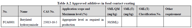 According to the information in the above Tables, Butylated hydroxyanisole (CAS No. 25013-16-5) is permitted in food contact plastic, coating, rubber, adhesive, and paper, but is not allowed in food contact ink or others. Meanwhile, it could be noted that the maximum level of Butylated hydroxyanisole in different FCM is different.