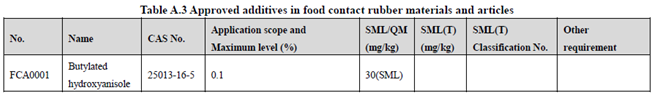 GB 9685-2016 takes the place of GB 9685-2008, and includes 1294 approved food contact additives. It specifies the principles for uses of additives in FCM, approved additive categories, application scope, and maximum permitted level, specific migration limit or maximum residue limit, total specific migration limit and other restrictions of the additives in FCM. Compared to the 2008 version, the additives and their usage requirements in the new version are listed separately in Table A.1 to Table A.7 of Annex A according to the category of the applicable scope. Take one additive - Butylated hydroxyanisole (CAS No. 25013-16-5) for example as following: