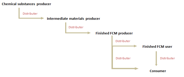 DoC is available for “Chemical substances” (Chemical substances refers to substances listed in GB 9685 including additives, solvents, colorants, etc. ) which will be used for producing FCM, “Intermediate materials” (Intermediate materials refers to materials such as resins listed in Product GB, premix, etc.) which will be used for producing finished FCM, and “Finished FCM” which will contact with food. Therefore, DoC will be delivered according to the following supply chain: