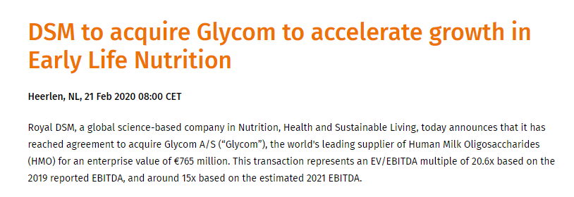 In 2020, DSM acquired Glycom A/S (Glycom) for an enterprise value of 765 million euros. The collaboration between the two in the early life nutrition field significantly accelerated the development of the HMOs product line. Currently, DSM is equipped with the production capacity for more than a dozen HMOs, and several of them have been successfully introduced to the market, making DSM a major driving force behind the commercialization of HMOs.