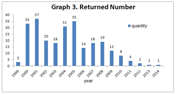 3. Most of the returned first registration health food products are applied before 2005, especially 2005, 2001 and 2000, and they have been decreased significantly in recent five years (2011~2016).