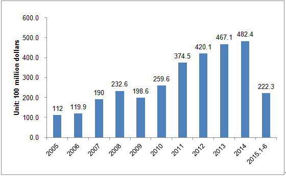 Figure 1. The trade value of imported food in China from 2005 to the first half year of 2015