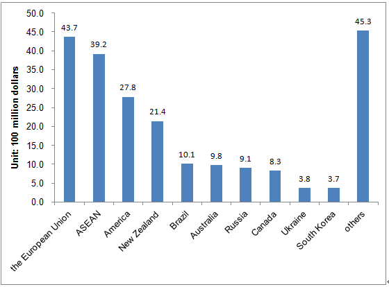 In recent years, the sources of imported food in China have turned more international. In the first half year of 2015, China imported foods from 179 countries or regions. Among them, the top 10 in imported trade value were: the European Union, ASEAN, America, New Zealand, Brazil, Australia, Russia, Canada, Ukraine and South Korea, with a total amount of 17.70 billion dollars, accounting for 79.9% of total trade value (figure 2).
