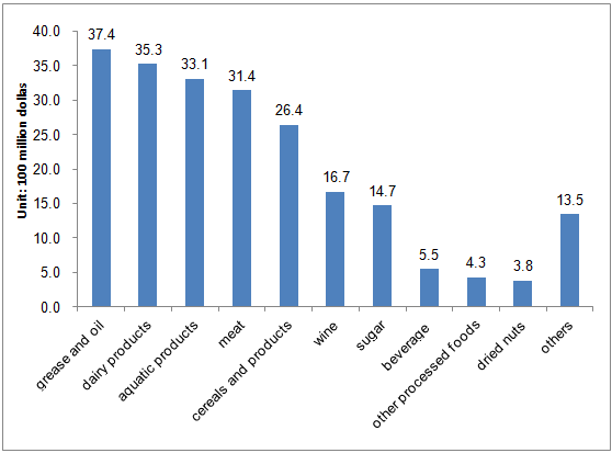 In recent years, the imported food categories in China have almost covered all kinds of global excellent foods. In the first half year of 2015, the top 10 food categories in imported trade value were: grease and oil, dairy products, aquatic products, meat, cereals and products, wine, sugar, beverage and other processed foods and dried nuts, with a total value of 20.87 billion dollars, accounting for 93.9% of total trade value (figure 3). Among them, the imported volume of vegetable oil, milk powder, meat and aquatic products reached 3.396 million tons, 987 thousand tons, 1.325 million tons and 2.006 million tons, respectively.