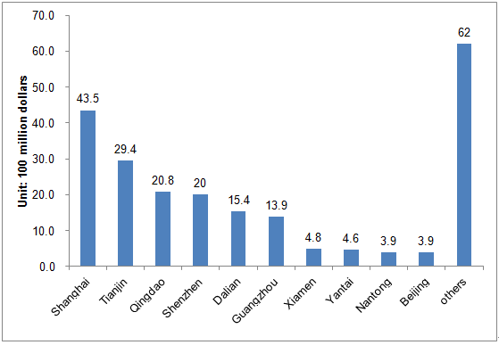 The import ports have become more and more in recent years, and mainly in coastal areas. In the first half year of 2015, there were 287 ports used to import food. The top 10 imported ports in imported trade value were: Shanghai, Tianjin, Qingdao, Shenzhen, Dalian, Guangzhou, Xiamen, Yantai, Nantong, and Beijing, with a total value of 16.03 billion dollars, accounting for 72.1% of the total trade value (figure 4)