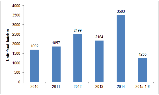 In the first half year of 2015, there were total 552,000 batches of imported food (20.35 million tons, 22.23 billion dollars) inspected and quarantined by local CIQs. Compared with the same time in 2014, the increase rates for the quantity, weight and sum of money were 11.9%, 21.2% and -10.8%, respectively. From 2005 to 2014, the trade value of imported food has increased by 4.3 times, and the average annual growth rate reached 17.6%, as showed in figure 1.