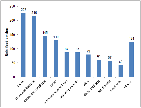 In the first half year of 2015, almost all types of imported food were detected in non-compliance with national standards of food safety and regulatory requirements in China. And the top 10 food categories in food batches were: drinks, cakes and biscuits, cereal and products, sugar, other processed food, aquatic products, wine, dairy products, condiments, and dried nuts, accounting for 90.1% of the total unqualified imported food batches(Figure 6).