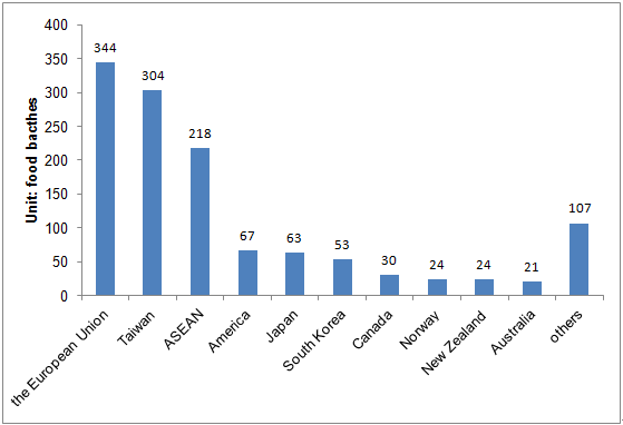 In the first half year of 2015, the local CIQ rejected or destroyed the unqualified imported food from 57 countries or regions. The top 10 sources of the non-compliant imported food were: the European Union, Taiwan, ASEAN, America, Japan, South Korea, Canada, Norway, New Zealand and Australia, respectively, which covered 91.5% of the total unqualified imported food batches (Figure 7).