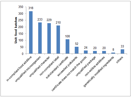 Different categories of imported food have different non-compliant reasons. The main rejected reasons for beverages, cakes and biscuits and sugar were food additives (like acid red, benzoic acid, sodium aluminosilicate, etc.) exceeded or out of the scope. And for wine and cereal grain products, the main unqualified reason was heavy metals (like Cu, Fe, etc. ) exceed the standard. And for imported aquatic products, food-borne pathogen contamination (like Listeria monocytogenes, Salmonella, and etc.) was the main unqualified reason.