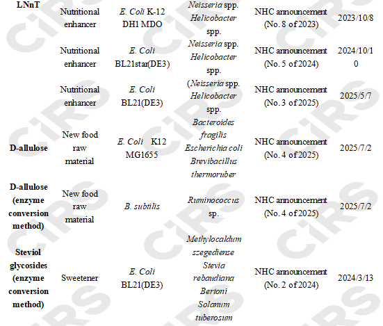 3 substances (18 products in total) produced by microbial fermentation have been successfully approved: among them, two are food nutritional enhancers 2’-fucosyllactose (14 products) and lacto-N-neotetraose (3 products); and one is a novel food ingredient: D-allulose (1 product).