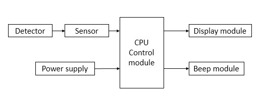 It is generally composed of a detector (accessory of the probe protection cover), a sensor, a CPU control module, a display module, a tone module, and a power supply module.