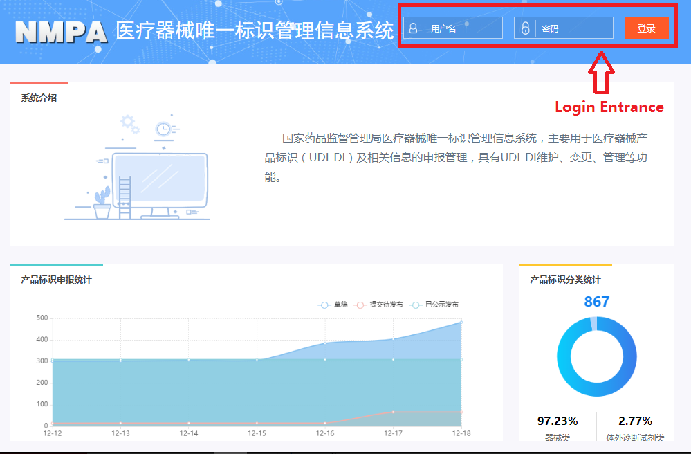 In order to make it easier for the public to view the development of the UDI system for medical devices, the "Medical Devices" section of the website of the NMPA has opened a "Medical Devices UDI System" column (see Figure 1). After clicking into the column, you can query related policies and regulations, work trends, database operation guidelines, etc. (as shown in Figure 2), and you can also enter the UDI database declaration login page (see Figure 3) through the "Entrance of Declaration" on this page.