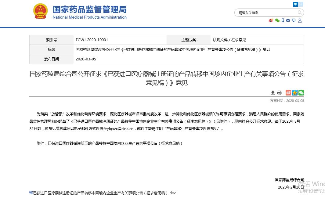 In order to implement the "regulation and service" reform and optimize the business environment, we will deepen the reform of the medical device evaluation and approval system, further simplify and optimize the requirements for medical device licensing, and meet the people's needs for use. The NMPA has organized the drafting of the Announcement on Matters Concerning the imported certificated medical devices products transfer to Chinese domestic enterprise production related matters (Draft for Comments), it is now open for public comments. Please send your comments or Suggestions by email to ylqxzc@sina.cn before March 31, 2020. Please indicate "feedback on matters related to product transfer and production" in the email subject.