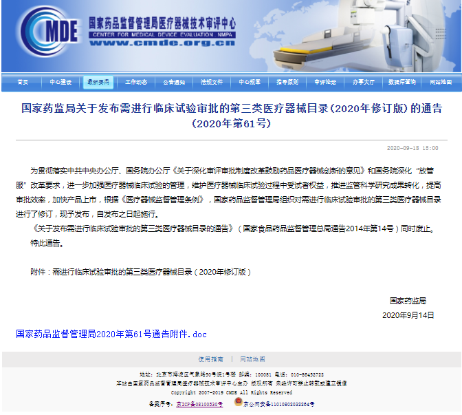 2020, September 14th, in order to further strengthening the management of medical instruments clinical trial in the process of maintenance of medical instrument clinical trial subjects rights and interests, promote the regulation of scientific research achievements, improve the efficiency of examination and approval, and to speed up the market, the NMPA organized the revision of the opinions on 'deepening the Reform of the Review and Approval System to Encourage innovation of Drugs and Medical Devices'. According to 'the regulations on the supervision and administration of medical devices', the NMPA organized the revision of the list of category III medical devices subject to clinical trial approval, which is hereby promulgated and shall come into force as of the date of promulgation.