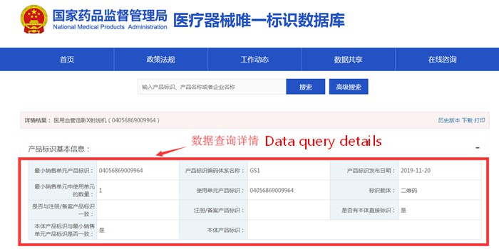 In order to facilitate the public inquiry, the homepage of the UDI database has set the query function and advanced query (shown in Figure 1) to meet the user's multi-condition and multi-angle query requirements. The details of the data query are displayed according to the different features of the product identification (shown in Figure 2), and auxiliary functions such as folding or unfolding of the query data, downloading, printing, and historical version records are also set.