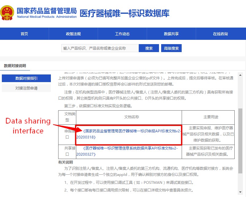 UDI database has set up the interface docking data sharing method. Click the "Data Connection Instructions" column on the homepage, fill in the connection application online, and obtain the connection authorization code. Download the latest version of the "NMPA Medical Device Unique Device Identification Database Sharing API Standard Document" (shown in Figure 4 and 5), and develop the docking function according to the document requirements. After the joint debugging test is passed, users can obtain data through the interface.